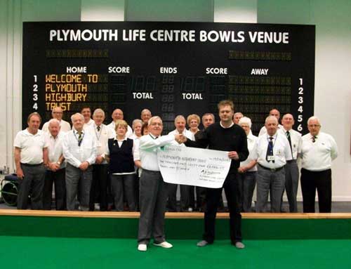 A cheque presentation from the Plymouth Life Centre indoor bowls club to Plymouth Highbury Trust.